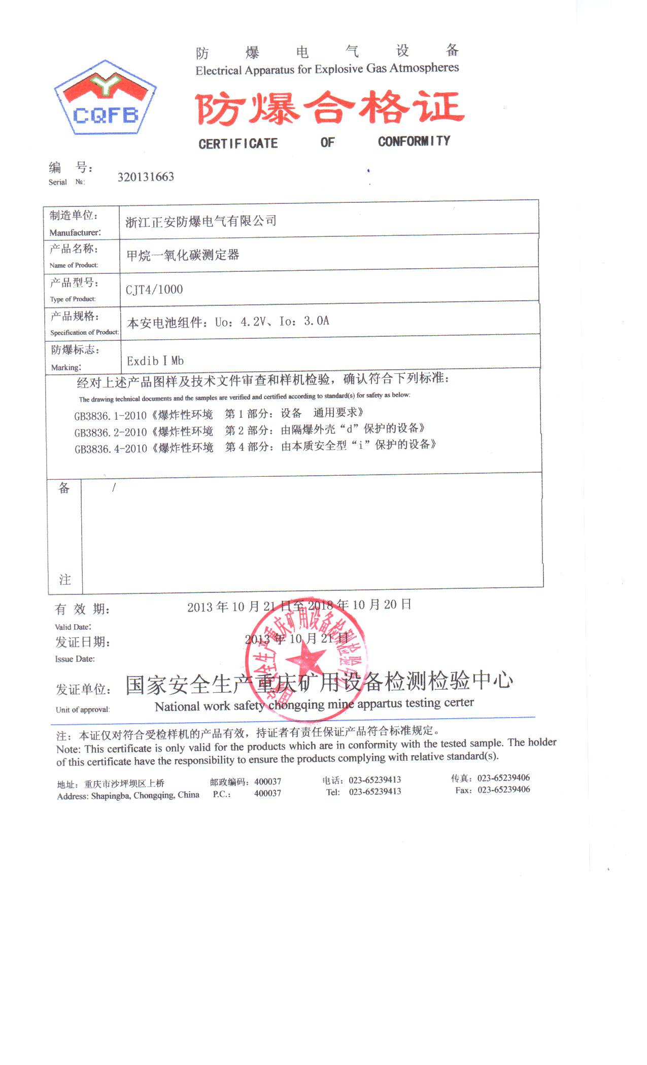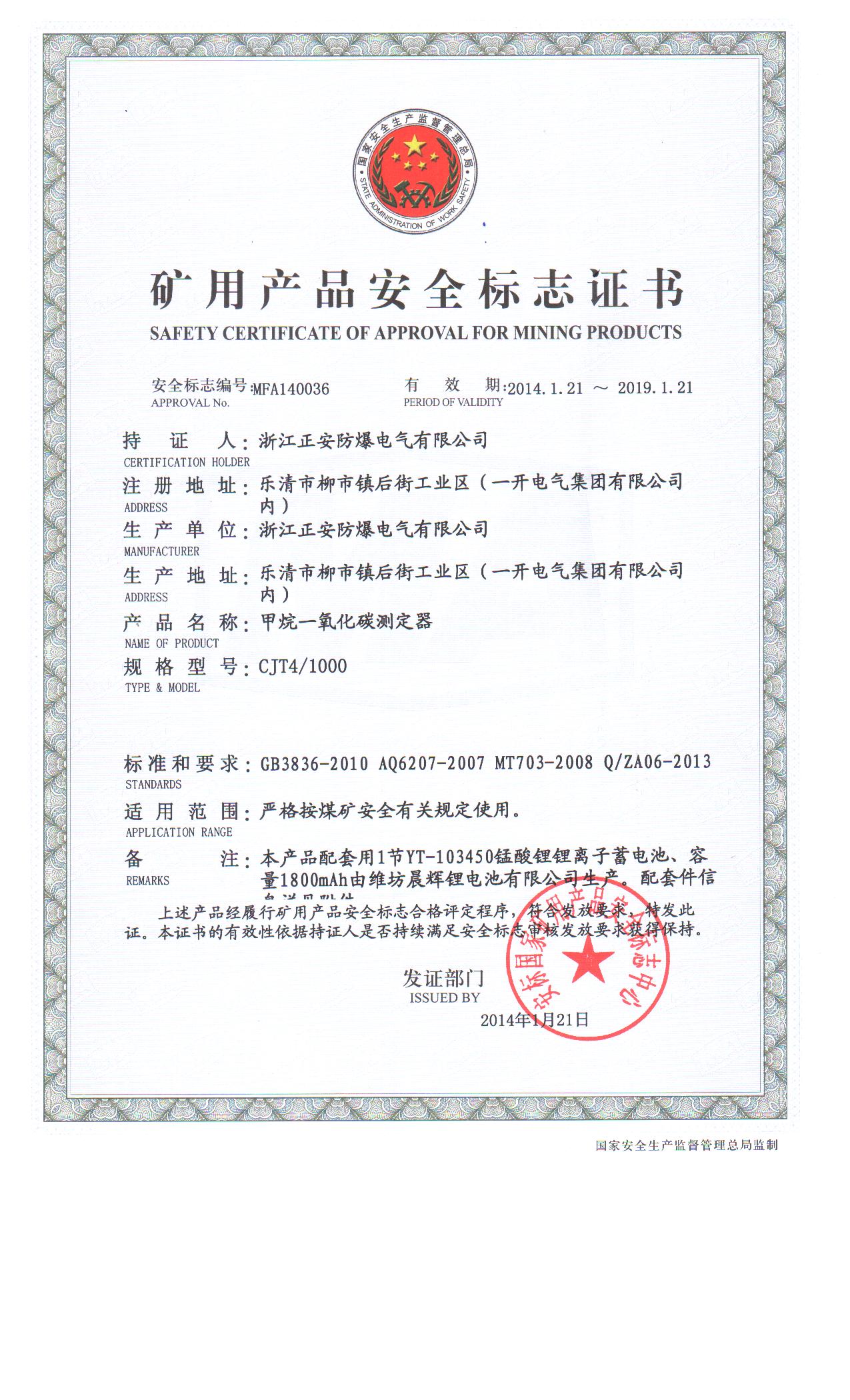 甲烷CO安標(biāo)證