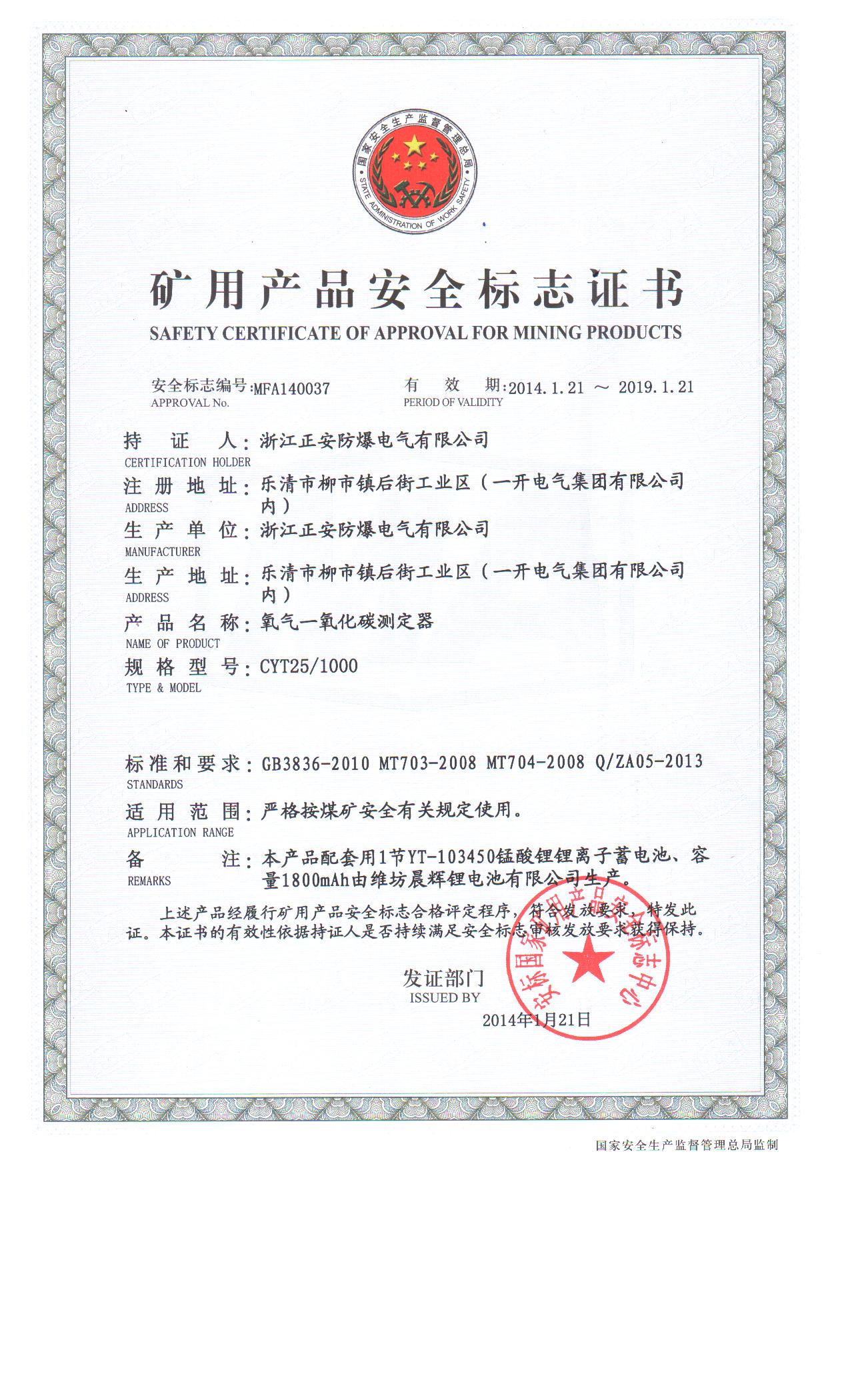 氧氣CO安標(biāo)證
